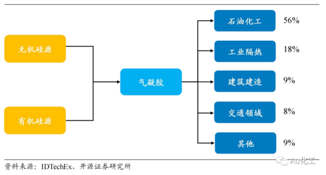 從硅基氣凝膠產(chǎn)業(yè)鏈來看,硅源材料主要分為無機(jī)硅源和有機(jī)硅源,無機(jī)硅源包括四氯化硅和水玻璃,有機(jī)硅源包括正硅酸甲酯(TMOS)、正硅酸乙酯(TEOS)、烷氧基硅烷等功能性硅烷。而下游的氣凝膠制品包括氣凝膠氈、氣凝膠紙、氣凝膠布、氣凝膠板材、氣凝膠粉末等,下游應(yīng)用場景廣泛,涉及石油化工、建筑建造、工業(yè)隔熱、交通等領(lǐng)域,其中石油化工為最大應(yīng)用領(lǐng)域,消費(fèi)占比達(dá)到56%,其次應(yīng)用于工業(yè)隔熱,占比為18%。在新能源領(lǐng)域,氣凝膠則主要應(yīng)用于動力電池電芯之間的隔熱阻燃、模組與殼體之間的隔熱防震層、電池箱的外部防寒層和高溫隔熱層等。在新能源汽車方面,氣凝膠能夠有效解決低溫環(huán)境下磷酸鐵鋰電池的保溫問題以及高溫環(huán)境下三元電池?zé)崾Э財U(kuò)散問題,是鋰電隔熱的首選材料。