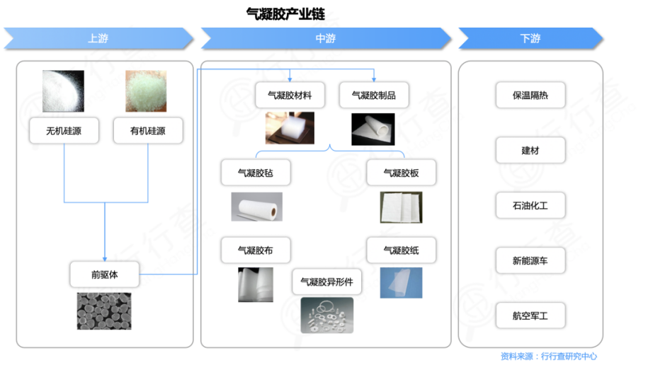氣凝膠產(chǎn)業(yè)鏈包括上游氣凝膠前驅(qū)體(無機(jī)硅源和有機(jī)硅源)、中游氣凝膠材料制品和氣凝膠生產(chǎn)設(shè)備、以及下游應(yīng)用等環(huán)節(jié)。