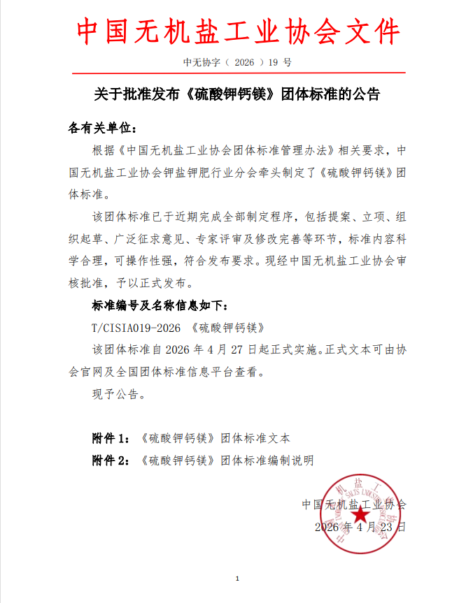 關(guān)于批準(zhǔn)發(fā)布《硫酸鉀鈣鎂》團(tuán)體標(biāo)準(zhǔn)的公告